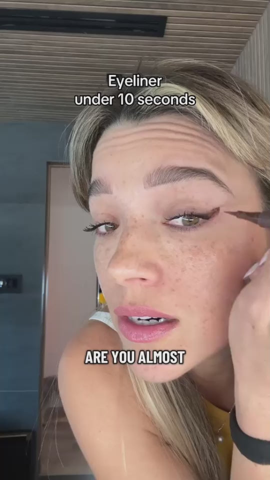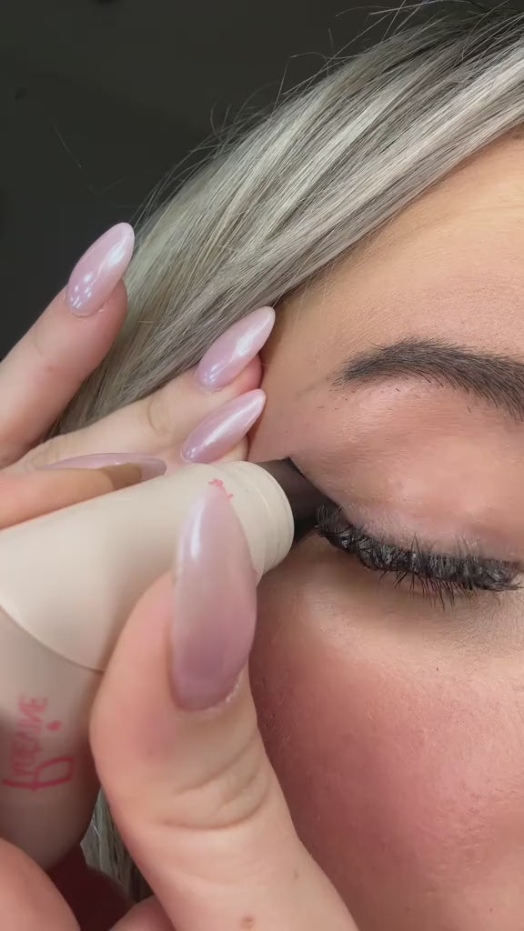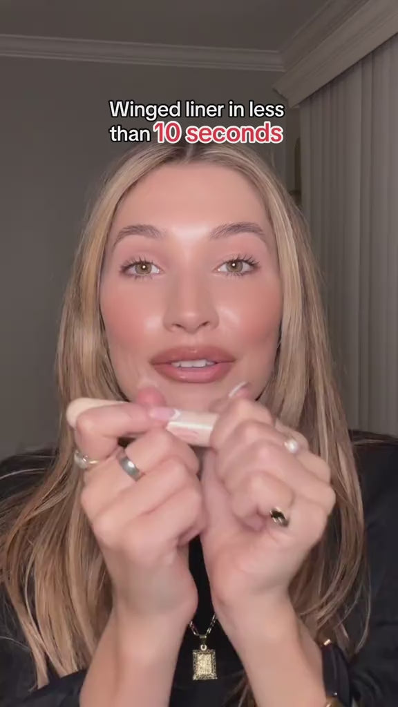 Designed with a rotating stamp head for perfect angle control and a dual side system for both eyes, this tool delivers a precise satin black wing every single time. The built in liquid reservoir ensures smooth even color without skipping or tugging. The waterproof smudge proof formula lasts through sweat heat and long days… yet removes gently with any makeup remover.